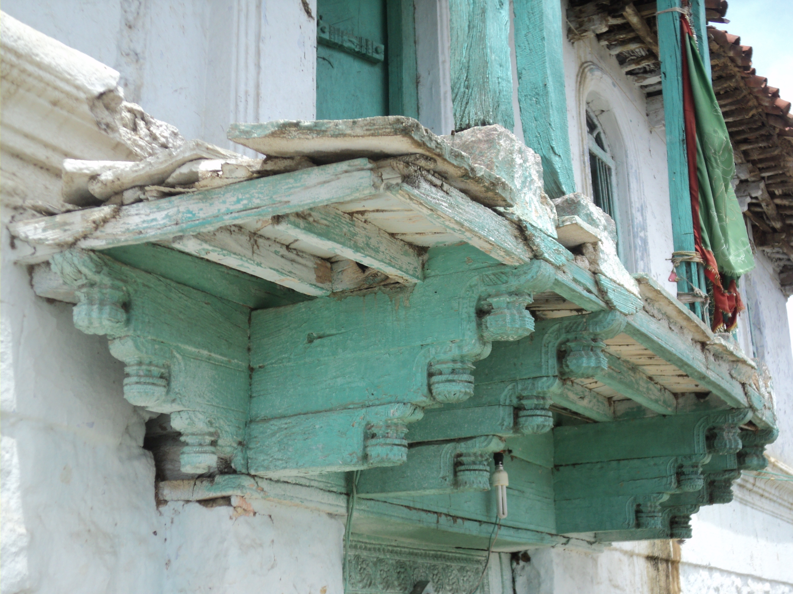 Annual average rainfall here is 922 mm, which is more than UP. This change is reflected in the pitched roofs of this region. They are made of an intricate system of Neem wood trusses, rafters and batons and inclined at an angle of 23 degrees. The closely spaced batons provide an almost impervious surface on which is topped a stiff mixture of mud, 3”-5” thick. This section of mud has two purposes- to hold the semi- circular hollow clay tiles that come over them and to provide an extra layer of insulation from the intense summer sun.