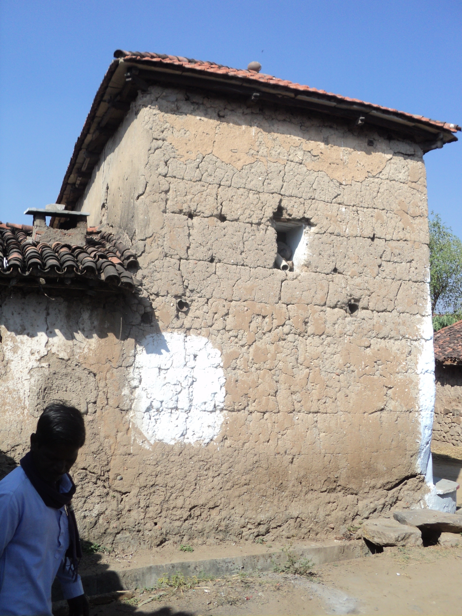 The Medak District of Telangana of the newly formed state, is a study in contrast. Located in the Deccan Plateau region of the Indian Subcontinent at an altitude of 442m AMSL, this region is characterized by hot and dry summers and moderately cold winters. The prevalent building construction technique here is that of cob- balls of semi-wet, stiff mud slapped on and massaged together to form load bearing walls. These walls vary in thickness from 18” to 24” and can rise up to 20’ in height if built well. Good quality granite stone is available in this region. Due to its superior compressive strength and impervious nature, they are dressed by a mason and used in the foundation, plinth and external walls upto the cill level using mud mortar. This is done to protect the external mud walls from the splash back of the rain. Stone chips are used in the cobbing process to prevent excessive cracking due to drying.