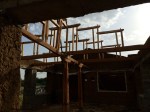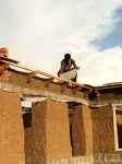 The technique of mud that is used indigenously in this region is that of cob-balls of slightly wet stiff mud slapped on top of each other to form the wall. The earth that is excavated from the foundation and the sunken amphitheatre are mixed well with water and lime slurry. The lime acts like a local stabilizer binding the clay particles together. They also deter termites. These are then made into small balls of diameter of 6’-9” that are easy to hold and throw. Each wall section is 1.5’ high. This left to dry for a few days before the next sections begins to prevent the wall from collapsing under its own wet weight. At the 7’ lintel level another RCC Lintel band is cast running continuously across all the walls. This is joined to the lower plinth band at the corners and the junctions with a single reinforcement rod. This flexible frame counters the lateral movements of an earthquake keeping the damage to a minimum. The lintel band also helps in redistributing the load on the mud walls and provides for larger window openings to negate the drawbacks of traditional building materials. As mud has a poor compressive strength, walls need to be at least 18” thick. This adds to the its thermal mass thereby acting like a heat battery, slowly absorbing and storing the heat during the day and radiating it back in the night. Therefore there is difference of 8-10 degree Celsius between peak summer and winter interior and exterior temperatures.