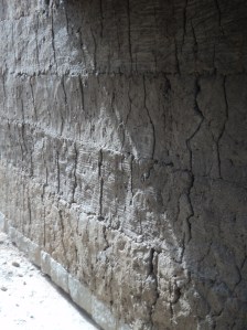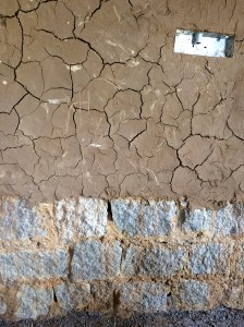 Mud walls once built using un-stabilized mud (without adding any chemical stabilizers like cement) need to be plastered with a mixture of sieved mud, wheat husk or tudi, sand, cow dung or gobur and water to protect it from rain, damage, etc. This is an indigenous skill and almost every person in a village knows it. Three coats of this plaster are applied on top of each other after the drying of the former and once ready, through the following of a process you get an end product that is aesthetically unmatched by any commercial product.
