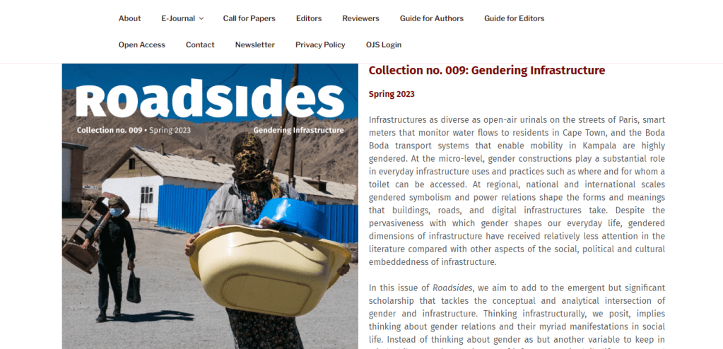 I was happy to serve as one of the reviewers for the Open Access e-journal Roadsides‘ Spring 2023 Issue, titled Gendering Infrastructure. Many thanks to Sneha Annavarapu and Yaffa Truelove for the invitation. To read the full Issue, please visit https://roadsides.net/collection-no-009/.