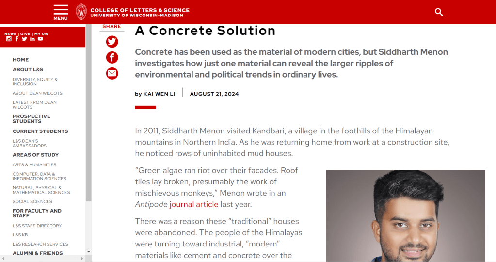 Work from my Master’s degree on the social dimensions of concrete houses in India was featured in the University of Wisconsin-Madison Letters & Science Newsletter. Many thanks to Kai Wen Li for taking interest in my work and for writing this excellent article.
