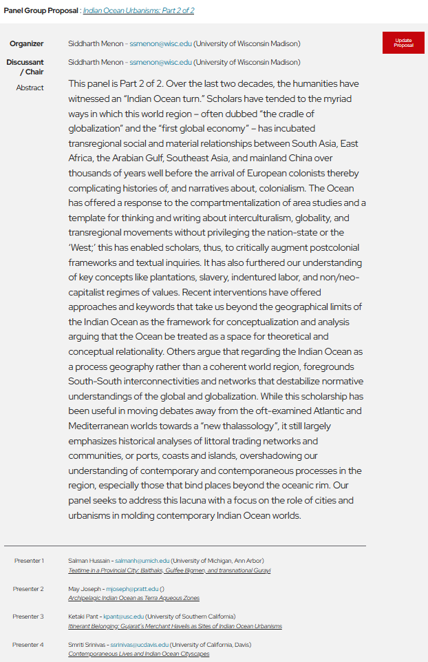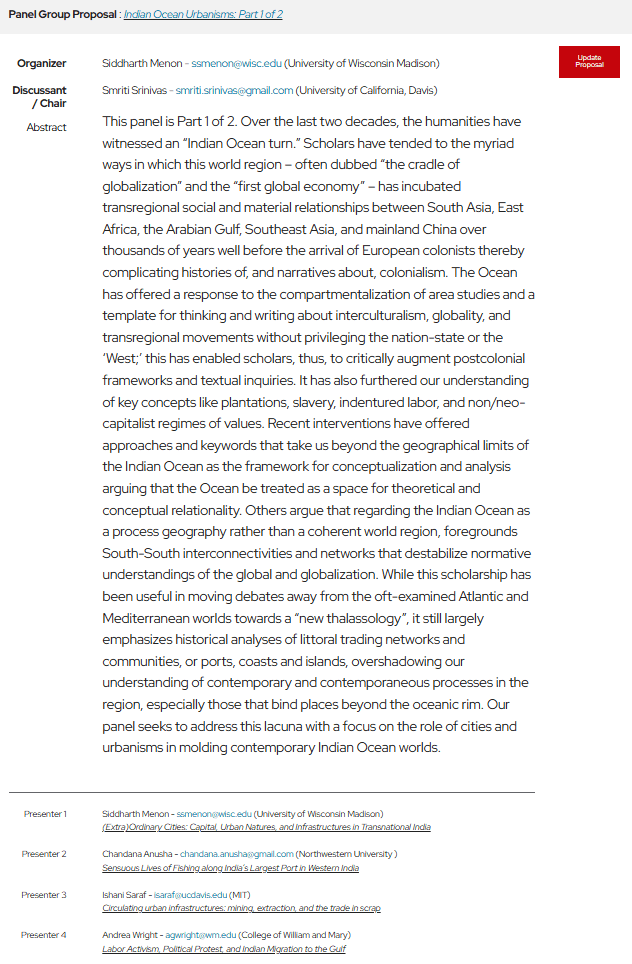 Dr. Smriti Srinivas and I organised a panel on “Indian Ocean Urbanisms” at the 54th Annual Conference on South Asia in Madison, Wisconsin on October 24, 2025. Many thanks to the participants for making this an engaging session (CFP below).